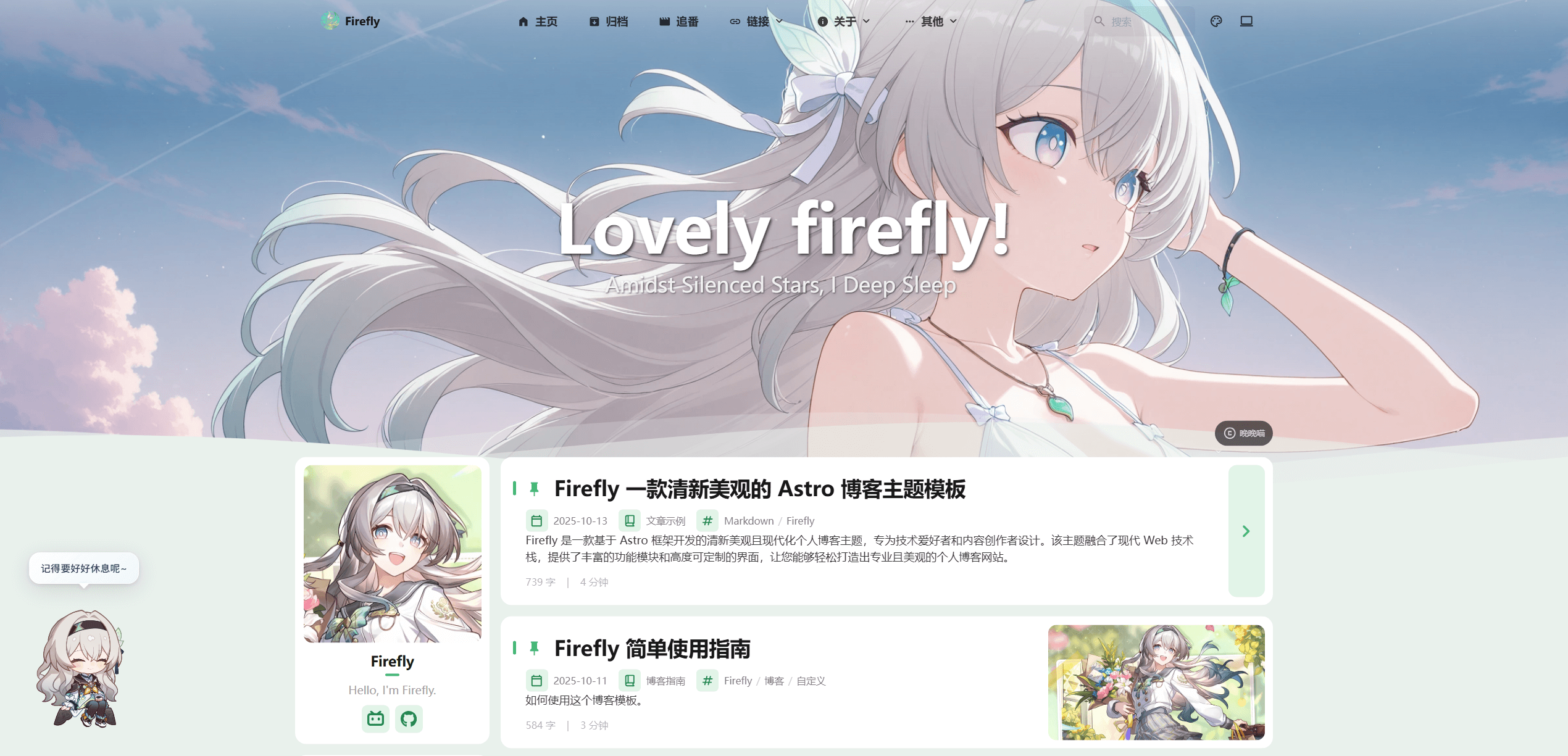 Firefly 是一款基于 Astro 框架的模板开发的清新美观且现代化个人博客主题,专为技术爱好者和内容创作者设计。该主题融合了现代 Web 技术栈,提供了丰富的功能模块和高度可定制的界面,让您能够轻松打造出专业且美观的个人博客网站,是我基于Fuwari和Mizuki二次开发的开源项目,欢迎大家使用。